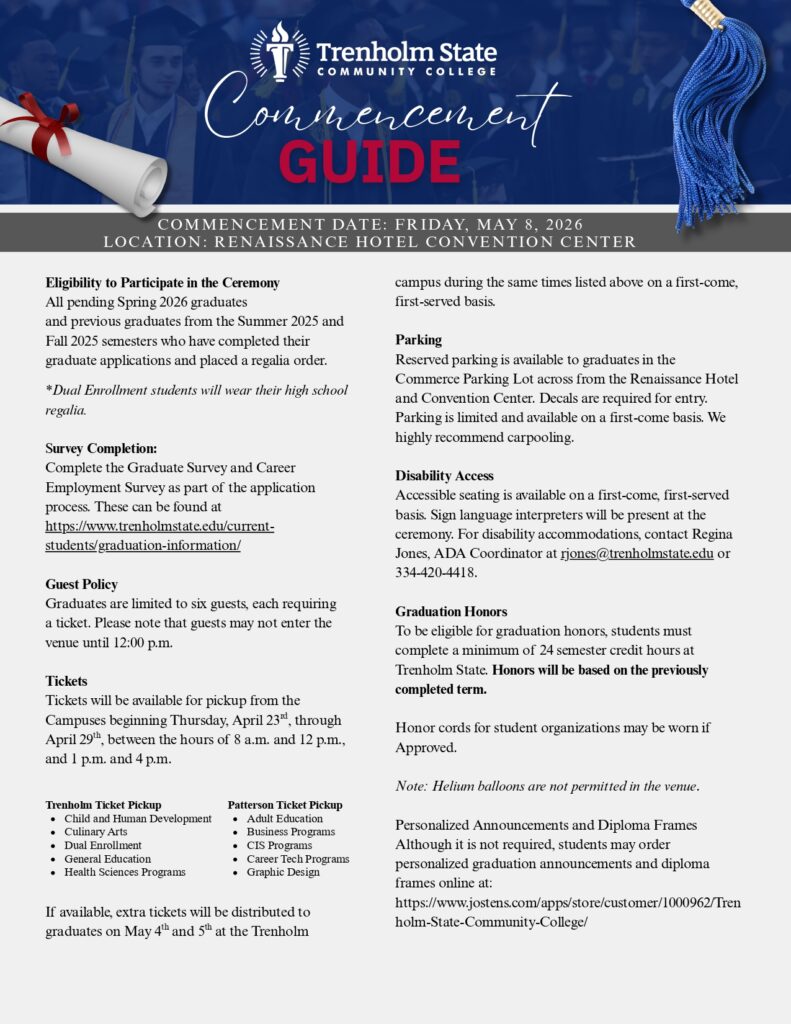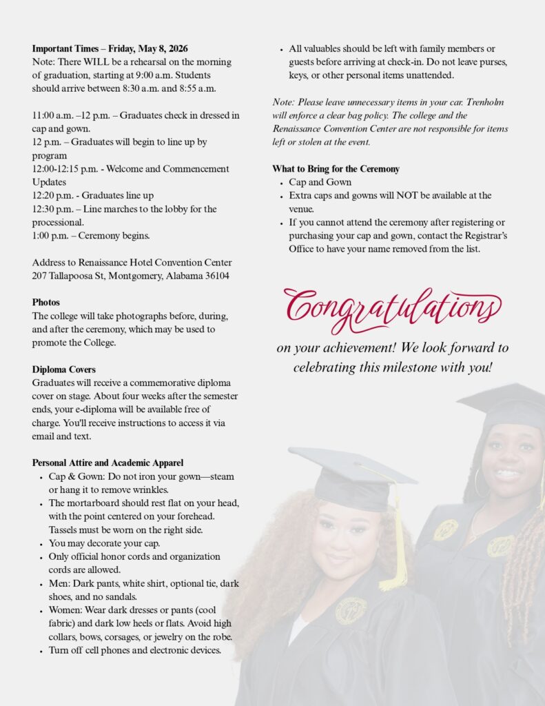 Trenholm State offers a digital degree to students right after graduation. Upon completing a degree or certification program, graduates will receive an email and text notification with instructions for electronically claiming their degree or certificate; it’s a great way to immediately share your accomplishment with your family, friends, and potential employers.